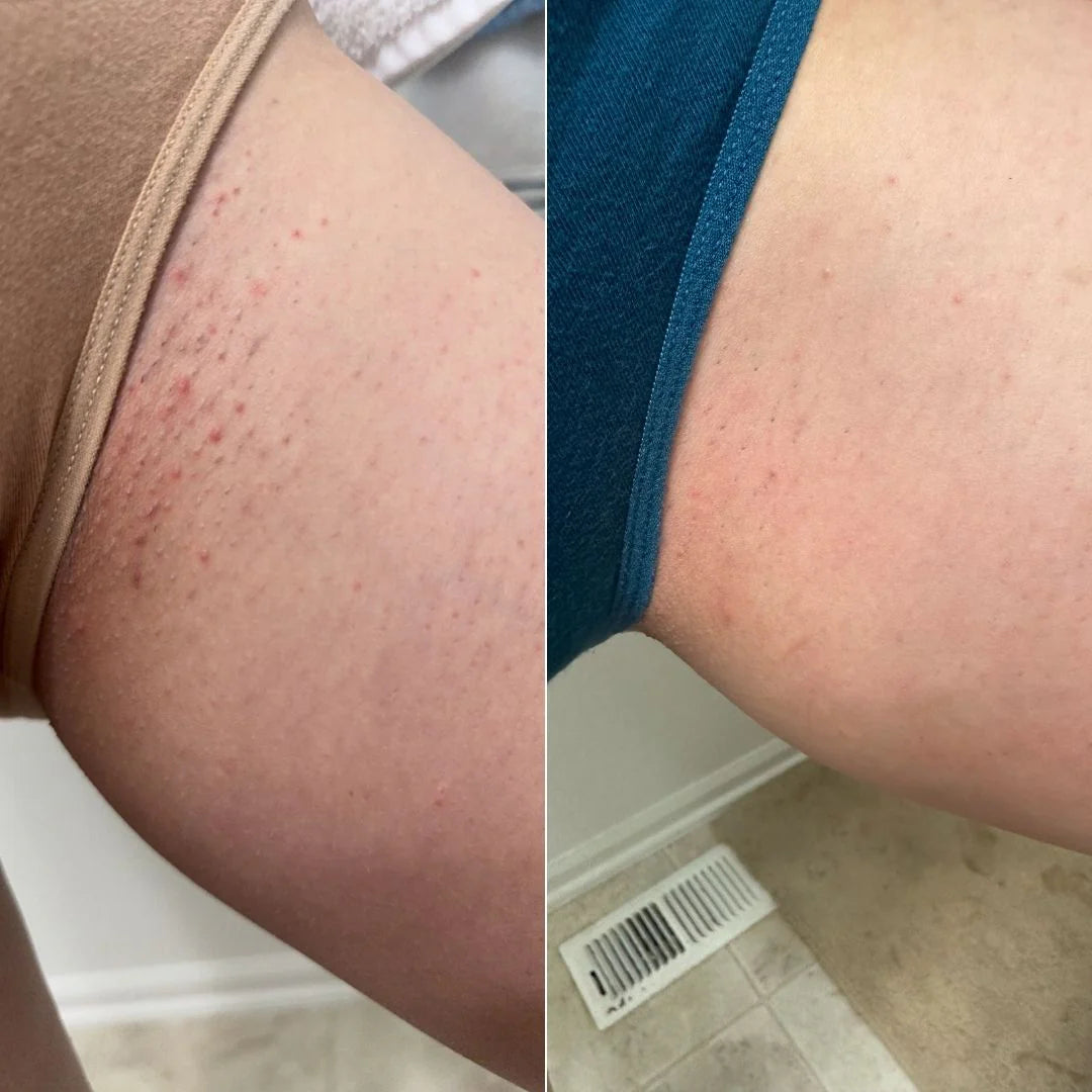 Beim Rasieren schneidest du das Haar am dicksten Teil ab – dadurch entstehen raue, dunkle Stoppeln. Das Serum wirkt an der Wurzel: Mit der Zeit wird das Haar feiner & heller.